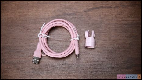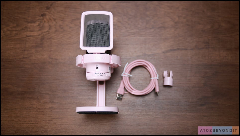 마오노 DGM20의 구성품을 살펴볼까요? 마이크 상단에는 소음 제거/음소거 버튼이 있습니다. 녹음 중 불필요한 배경 소음을 제거하며, 필요할 때는 마이크를 쉽게 음소거할 수 있습니다.