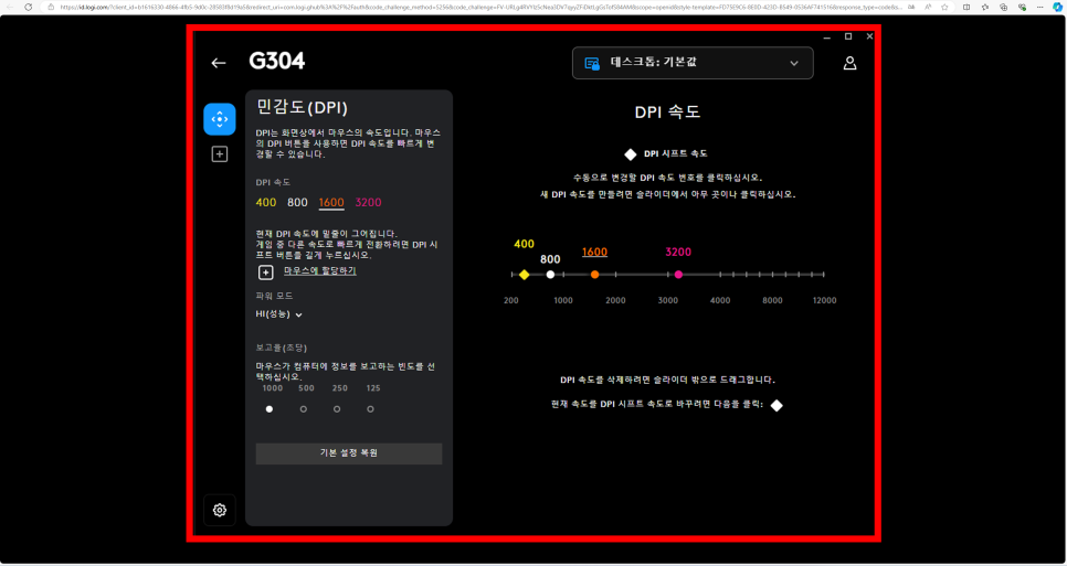 다음으로 로지텍 G304를 사용하면서 가장 많이 사용하는 기능이 DPI 전환버튼인데요. 평상 시에 사용할 때와 게임을 할 때 DPI를 전환하면 사용했었는데, 마우스의 DPI 전환 버튼을 누르면서 바꿀 수 있어 좋았습니다. DPI 수치 설정을 바꾸시기 원하시면 로지텍 G HUB 소프트웨어라고 로지텍 기기를 사용하시는 분들이 소프트웨어를 통해 설정을 조절할 수 있는 프로그램이 있습니다. 이렇게 로지텍 G HUB 소프트웨어에서 DPI 설정을 확인할 수도 변경할 수도 있습니다.